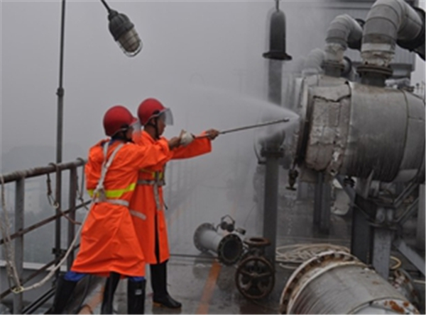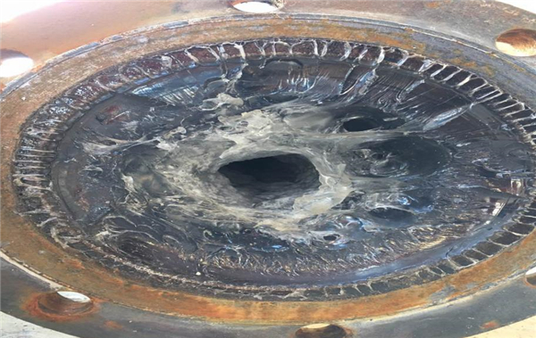 高压水射流清洗是采用特制的设备让水在管路内产生共振效应。利用管金属与管壁内残留物的不同物理特性再加上水的共振效应可破坏污垢与管壁之间的附着力并达到污垢剥离的目的。最后再利用水压的推力, 将污垢从管路内推出,最终达到除垢的目的,使所清洗的设备或管线达到生产所需的工艺条件。